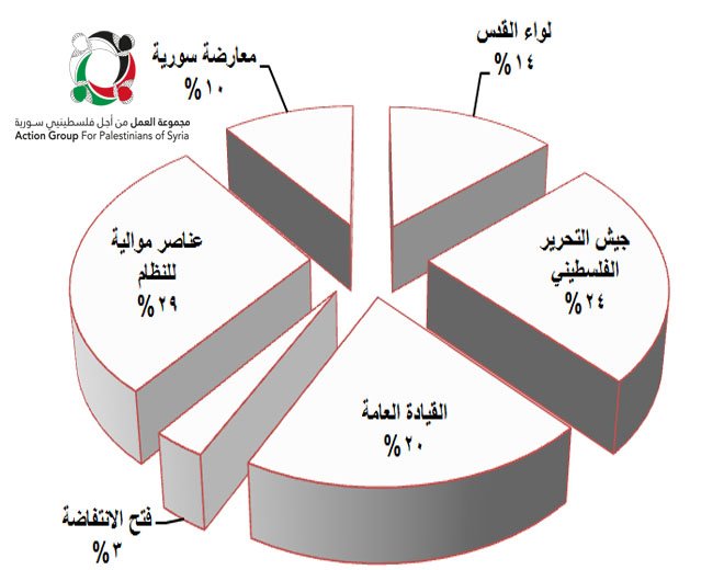 وأشار فريق الرصد والتوثيق إلى أن الضحايا توزعوا على الشكل التالي: (7) لاجئين قضوا أثناء قتالهم إلى جانب قوات المعارضة السورية المسلحة، و(19) لاجئاً ماتوا جراء قتالهم مع النظام السوري، بينما توفى (13) عنصراً من عناصر الجبهة الشعبية (القيادة العامة)، و(16) من مرتبات جيش التحرير الفلسطيني، فيما مات (9) عناصر من لواء القدس، وعنصران من فتح الانتفاضة.