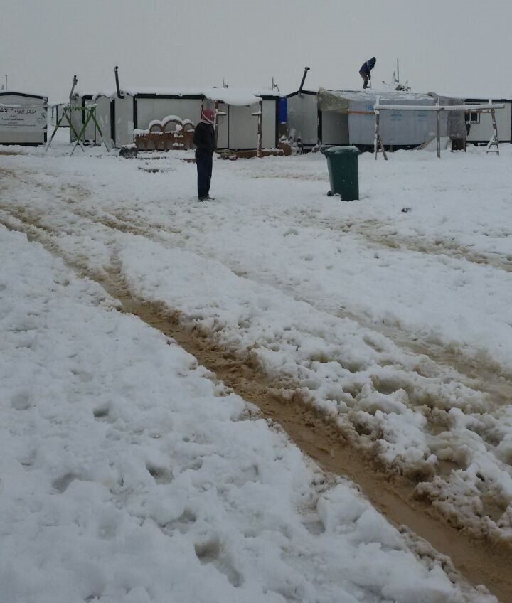 مع وصول العاصفة زينة الحالية، زرنا المخيم فوجدنا أن سماكة الثلوج المتساقطة على المنطقة زادت عن 35 سم، وبعد تجولنا على معظم المهجرين تبين أن أكثر ما يحتاجونه هو تأمين شوادر أو مشمّع لوضعه فوق الأسقف في محاولة لمنع تسرب المياه إلى داخل الغرف.