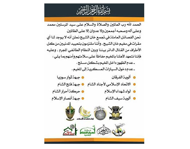 فيما تعهدت تلك الفصائل لأهالي مخيم خان الشيح في بيانها بالحفاظ على سلامتهم وأمنهم من خلال عدم الظهور داخل المخيم بشكل مسلح، وعدم دخول السيارات العسكرية إلى المخيم.