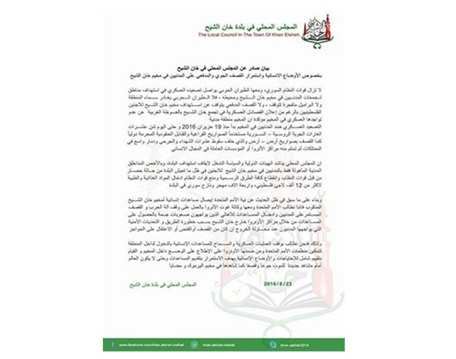 وطالب المجلس المحلي في بلدة خان الشيح بوقف العمليات العسكرية للسماح للمساعدات الإنسانية بالدخول و لتمكين منظمات الأمم المتحدة ومن ضمنها الأونروا بالإطلاع على الوضع داخل المخيم و القيام بتقييم شامل للإحتياجات والأوضاع الإنسانية بهدف الاستمرار بتقديم المساعدات و حتى لا يتفاجأ العالم بيرموك آخر أو مضايا آخرى.