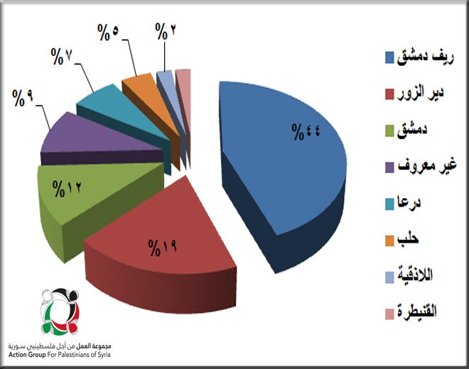 فيما أشارت مجموعة العمل إلى أن الضحايا الفلسطينيين الذين قضوا خلال أيلول- سبتمبر الفائت توزعوا حسب مكان وفاتهم على النحو التالي: في ريف دمشق قضى (19) لاجئاً، و (8) لاجئين في دير الزور، و(5) لاجئين في دمشق، إضافة إلى ثلاثة لاجئين في درعا، وشخصان حلب، ولاجئ قضى في اللاذقية، وآخر في القنيطرة، و(9 )أشخاص توفوا في أماكن متفرقة.