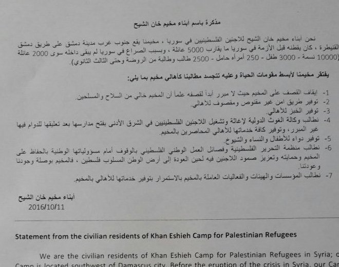 أكدت المذكرة التي وصلت نسخة منها إلى مجموعة العمل من أجل فلسطيني سورية على أن مخيم خان الشيح يفتقر لأبسط مقومات الحياة وعليه طالبوا طرفي الصراع في سورية بإيقاف القصف على المخيم حيث لا مبرر ابداً لقصف، علماً أن المخيم خالي من السلاح والمسلحين، وتوفير طريق أمن غير مقنوص ومقصوف لخروج ودخول الأهالي منه وإليه، وتوفير الخبز للأهالي.