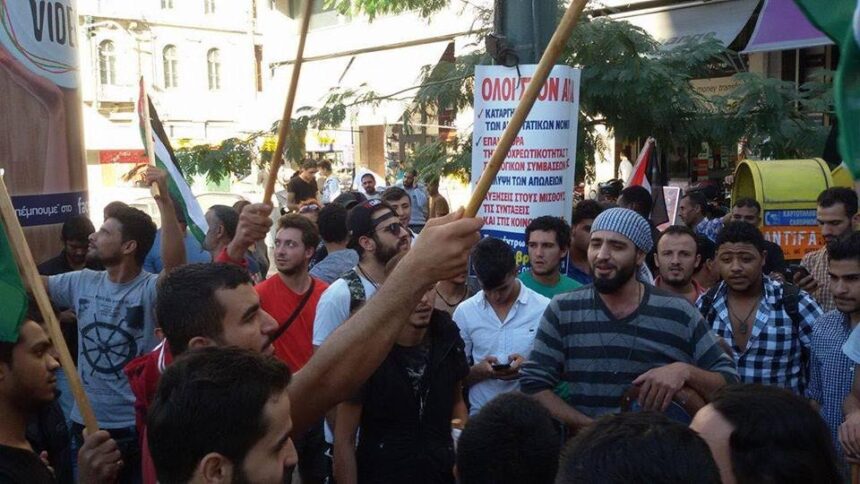 نظم العشرات من اللاجئين الفلسطينيين السوريين العالقين في العاصمة اليونانية أثنيا، يوم أمس، اعتصاماً تضامنياً مع مخيم خان الشيح للاجئين الفلسطينيين في ريف دمشق، عبروا فيه عن اسنتكارهم لما يتعرض له المخيم من استهداف مكثف بالطائرات الحربية خلال الأسابيع الأخيرة، الأمر الذي أدى إلى وقوع العشرات من الضحايا والجرحى من أبناء المخيم.
