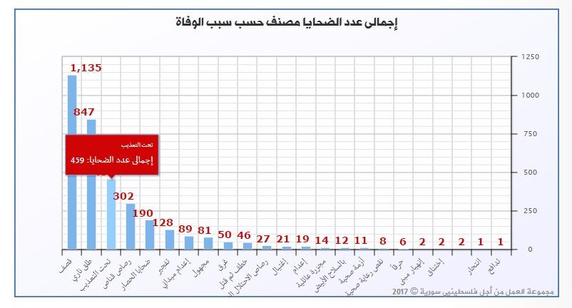 وثق فريق الرصد والتوثيق في مجموعة العمل من أجل فلسطينيي سورية (459) حالة موت تحت التعذيب للاجئين فلسطينيين في سورية، وذلك بعد اعتقالهم لفترات متفاوتة في سجون النظام السوري.