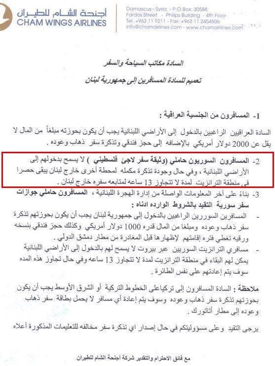 وبالنسبة للآجئين الفلسطينيين قال التعميم بمنع دخول حملة الوثائق الفلسطينية السورية إلى الأراضي اللبنانية ، و في حال وجود تذكرة مكملة لمحطة أخرى خارج لبنان يبقى حصراً في منطقة الترانزيت لمدة لا تتجاوز 13 ساعة لمتابعة سفره حارج لبنان .