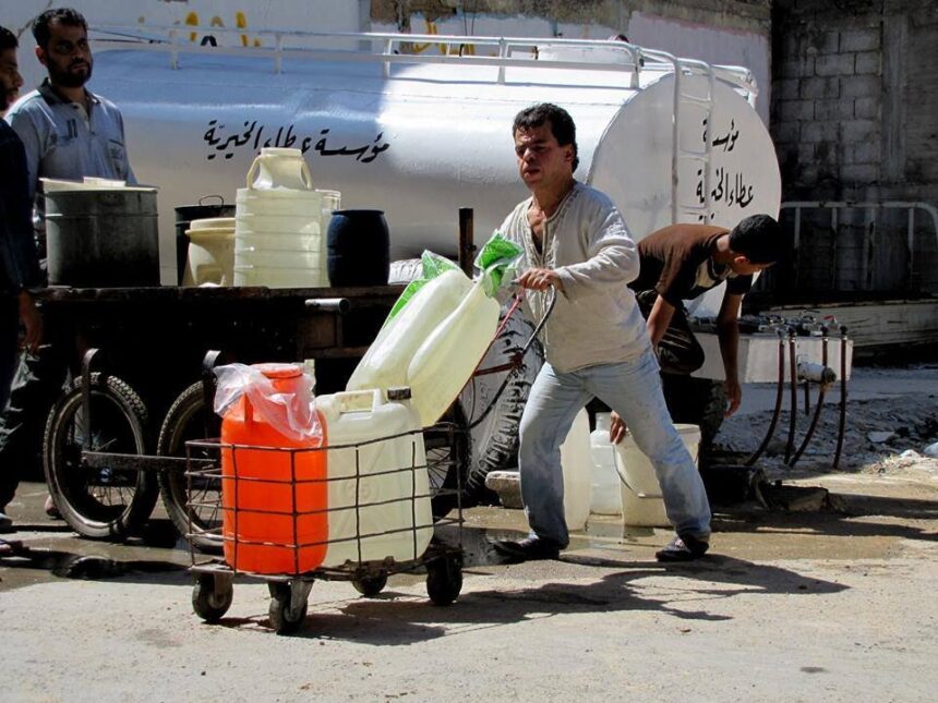 في غضون ذلك عملت  الهيئات واللجان العاملة على الأرض في مخيم اليرموك جاهدة على تأمين مياه الشرب لقاطنيه من خلال إيصالها لمنازلهم عبر الصهاريج، رغم ما تعانيه من غلاء لسعر المحروقات وعدم توفرها بسبب الحصار المفروض على المخيم