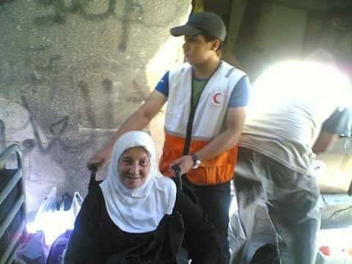 صورة تظهر إدخال الهلال الأحمر الفلسطيني للحاجة آمنة اللبابيدي إلى مخيم اليرموك