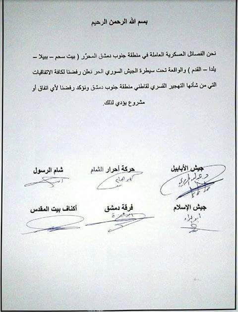 ووقع على البيان كل من: جيش الأبابيل، حركة أحرار الشام، شام الرسول، جيش الإسلام، فرقة دمشق، أكناف بيت المقدس.