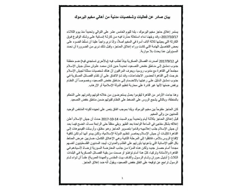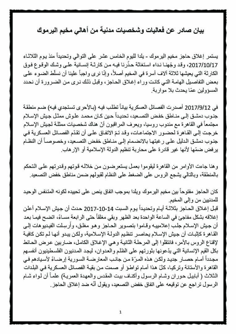 ووفقاً للبيان الذي تلقت المجموعة نسخة منه، فإن الفصائل الهسكرية كانت قد أغلقت الحاجز منذ صباح يوم 17 أكتوبر – تشرين الأول 2017، لاستعراض قوتها وسيطرتها على المنطقة خلال اجتماعات ممثليهم مع روسيا.
