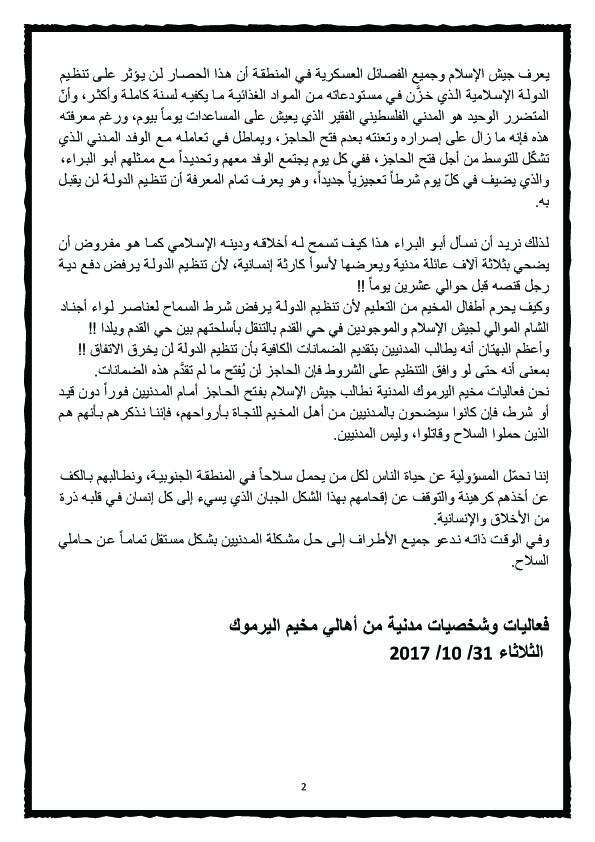 حذرت فعاليات مدنية في مخيم اليرموك من وقوع كارثة إنسانية بحق حوالي ثلاثة آلاف أسرة مدنية تعيش في مخيم اليرموك المحاصر، وذلك بسبب إغلاق فصائل المعارضة السورية المسلحة جنوب دمشق لحاجز يلدا / مخيم اليرموك الذي يعد المنفذ الأساسي لوصول المواد الغذائية للمحاصرين في المخيم.