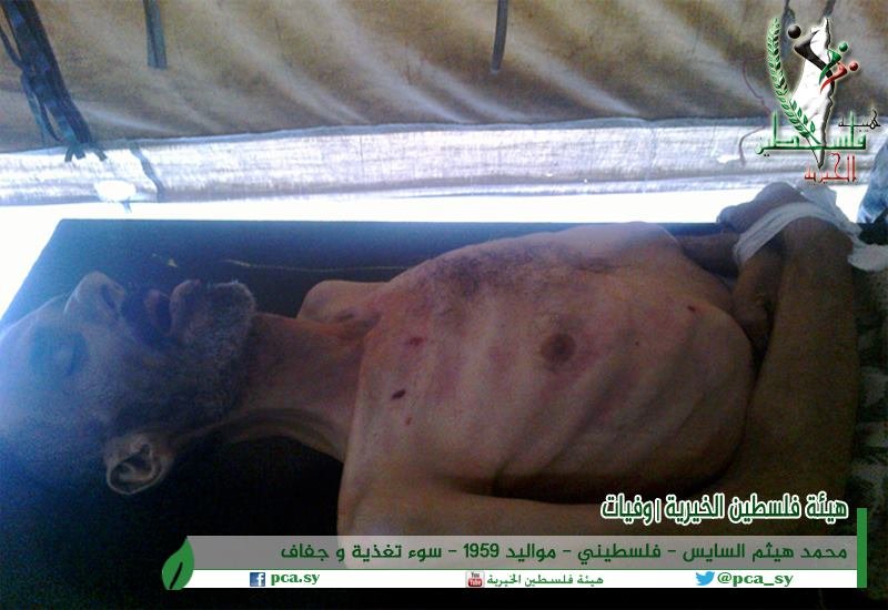 قضى اللاجئ “محمد هيثم السايس” من سكان مخيم اليرموك، ومواليد عام (1959)، وذلك إثر نقص التغذية بسبب الحصار المشدد الذي يفرضه الجيش النظامي ومجموعات الجبهة الشعبية – القيادة العامة، منذ (600) يوم، مما يرفع حصيلة ضحايا الحصار في مخيم اليرموك الذين قامت مجموعة العمل بتوثيقهم إلى (169) ضحية.