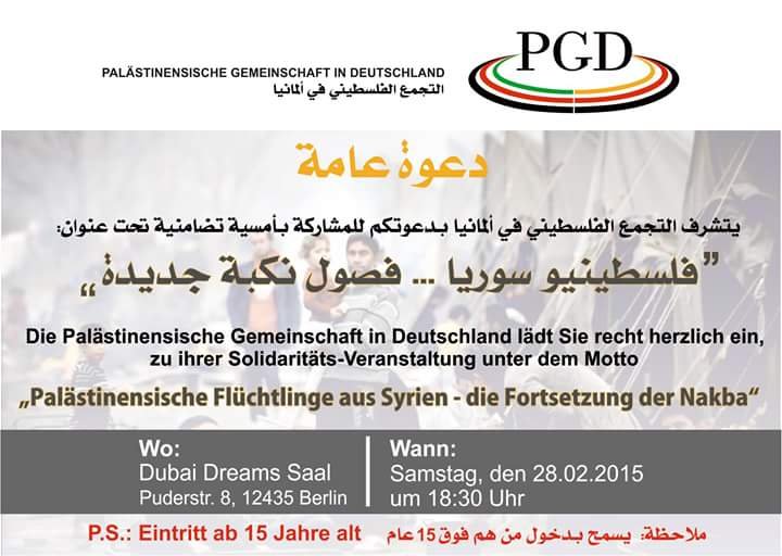 دعا التجمع الفلسطيني في برلين للمشاركة في أمسية تضامنية تحت عنوان ” فلسطينيو سوريا فصول نكبات جديدة” وذلك يوم السبت 28-2-2015 في صالة دبي دريمز في برلين يذكر أن الجالية الفلسطينية ومؤسساتها في أوروبا تشهد حراكاً ثقافياً نشطاً ضمن فعاليات تضامنية مع فلسطيني سوريا عموماً ومخيم اليرموك خصوصاً .