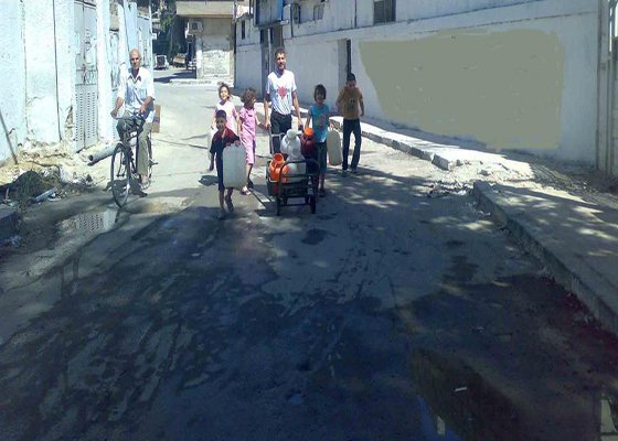 بدأت معاناة أهالي مخيم اليرموك من نقص المياه فيه تتفاقم خلال الربع الأخير من عام 2014، وذلك بسبب إيقاف تغذية المخيم عبر شبكة المياه القادمة من المناطق المجاورة منذ يوم 9/أيلول/2014 مما جعله على شفى كارثة إنسانية جديدة خاصة أن أزمة شح المياه بدأت مع مطلع الصيف وأدت إلى انتشار الأمراض فيه، كما أجبر الأهالي إلى قضاء عشرات الساعات بانتظار الحصول على بعض ليترات الماء من المناطق المجاورة للمخيم، حيث يضطرون للمسير والمخاطرة بحياتهم في سبيل تأمين المياه لأطفالهم.