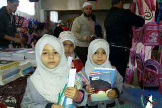 هيئة فلسطين الخيرية توزع اللوازم المدرسية على طلاب مخيم اليرموك النازحين في البلدات المجاورة