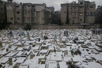 الكلاب تنبش بعض القبور إثر انهيارها بسبب الثلوج في مخيم اليرموك