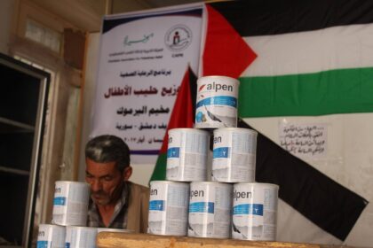 الهيئة الخيرية توزع حليب الأطفال على عائلات مخيم اليرموك النازحة إلى البلدات المجاورة