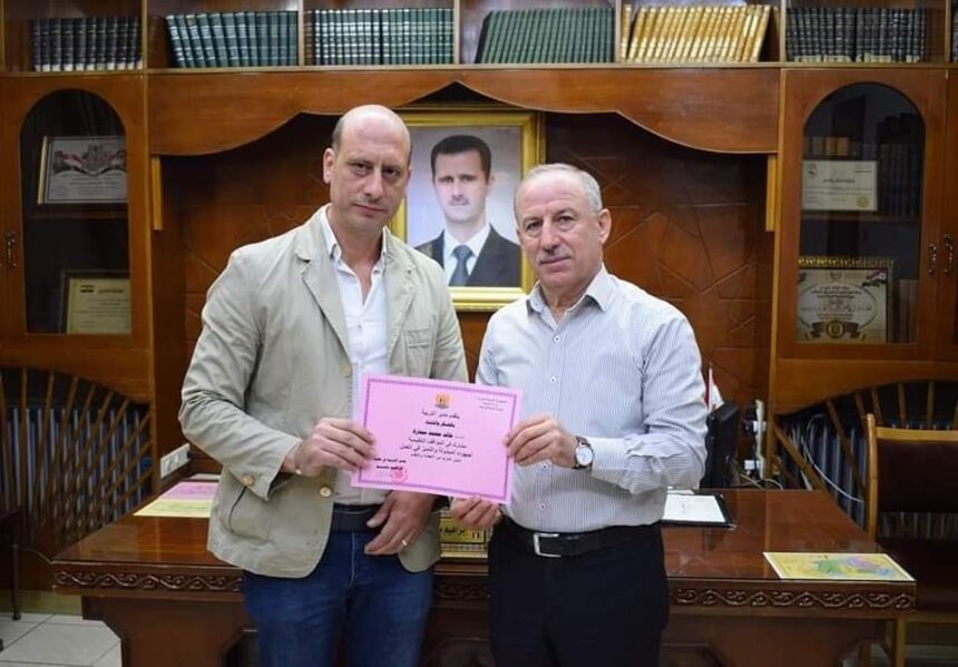 Palestinian refugee Khaled Mohamed Samara, from AlNeirab Camp, in Aleppo, was honored after he won the highest score in the alternative curricula development.Â
