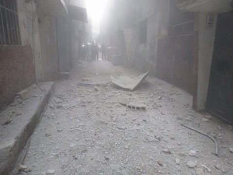 The shelling coincided with the outbreak of violent clashes on several axes between the Syrian army alongside the Palestinian groups and Al Nusra Front alongside Ahrar Al Sham.