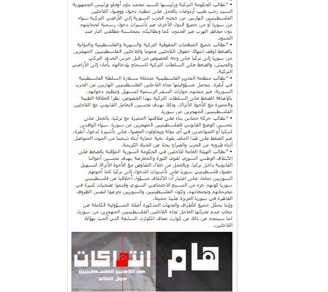 The statement appealed all Turkish, Syrian, Palestinian, and international human rights organizations to put pressure to stop refugee rights violation in general and Palestinian refugees displaced from Syria in Turkey in particular by the Turkish border guards and the army, and to put pressure on the Turkish authorities to allow them entering to Turkish territory safely.”