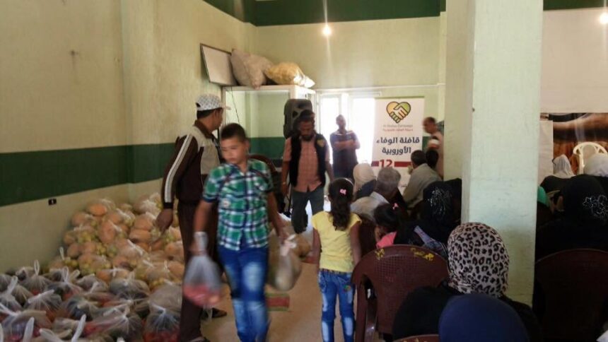 Al Wafaa European campaign distributed food aid to Palestinian refugees from Syria in Bar Elias in the Bekaa region, where the thirteenth convoy delegation visited 125 families living in this region, and provided them with vegetables, fruits, and meat baskets in order to alleviate their suffering.