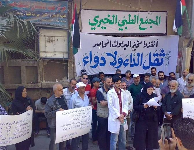 The PRCS medical staff organized a sit-in yesterday in front of Albasil hospital in Yarmouk demanding UNRWA, International Red Cross, Syrian Red Crescent, and medical and humanitarian organizations to enter medicine and medical supplies to the camp due to the deterioration of health situation, the severe shortage of medicines, and the spread of many chronic diseases, typhoid, and jaundice, in addition to the high numbers of affected residents.
