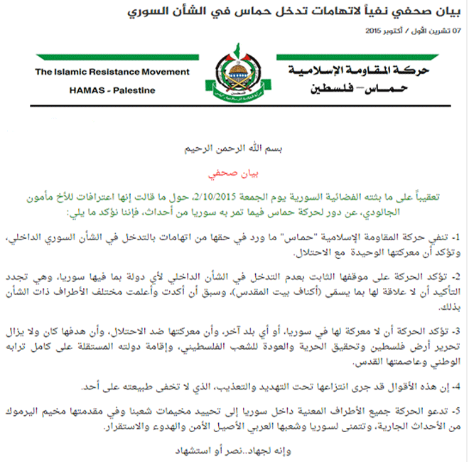 Hamas movement issued a press release in which it denied the charges of interfere in  the internal affairs of Syria, where the charges came after Syria TV broadcasted an interview on Friday 2/10/2015 with the leader of Aknaf “Mamoun Galoda Abu Jaafar”.
