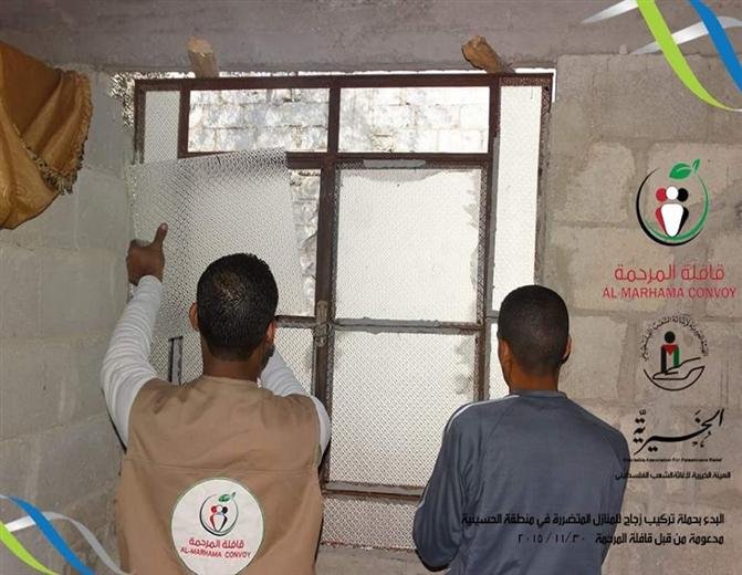 Also, in Al-Husayniyya Camp in Damascus Suburb, new glasses for windows of damaged houses were set up, and according to those in charge of the project, the beneficiaries of the project are orphan families and families of special needs or those of more than 7 dependents.