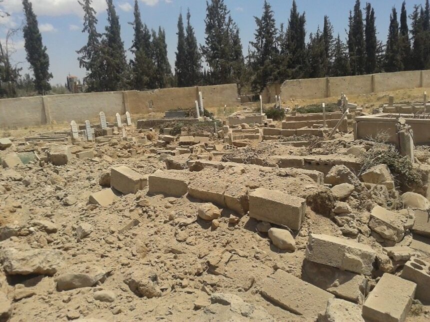 The Regime’s artillery positioned on Al-Kabousiya hill targeted a funereal in Khan Eshieh camp yesterday and killed “Ibrahim Mahmoud Mofleh Al-Kabiri”and injured others. The AGPS’ correspondent assured that the military bombarded the Eastern Cemetery of the camp while civilians were burying “Zuhir Ghazi Faour”who died earlier.