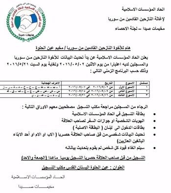 In Lebanon, the Union of Islamic relief organizations announced the start of data update for the  displaced Palestinian Syrians living in Ein Al Hilwa refugee camp, and who are registered starting from Monday, 02.05.2016 until Saturday, 05/21/2016. The Union pointed out that the Palestinians of Syria should bring the registration card of the Islamic institutions Union, personal identities, or passports, and the original cards of entering Lebanon,  stressing that updating data to be by (father, mother, one adult children, single, ), noting that restrictions will be canceled for each person who has not update his data.