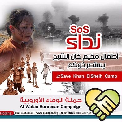 The Al-Wafa European Campaign launched calls to raise relief funds for Khan Al-Shih refugees. A so-called “Children of Khan Al-Shih Camp Cry for Help”campaign kicked off in an attempt to speak up for Palestinians taking refuge in an area that has been grappling with a tough blockade for over a couple of weeks, along with nonstop bombardment and acute dearth in medical kit and basic foodstuff.