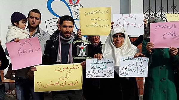 On the other side, the volunteers of Al Yarmouk Secondary School organized a protest sit-in demanding the International organizations the commissions and the institutions that work outside the camp to support the camp to continue with the teaching process.it is mentioned that in the beginning of the crises, the camp depended on the curriculum strengthening lessons for the secondary school students in a basement fearing from the shells, the classes contained at that time about 40 female and male students arts section and 35 Female and Male students science section, then, there was no place for the 10thy and 11th grades.