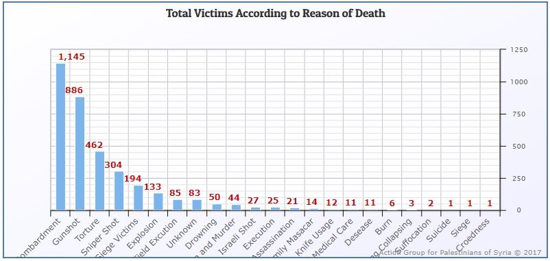Shelling took away the lives of 1,146 Palestinians. 885 others were killed in bloody hostilities between the regime army and the opposition outfits. At the same time, 463 Palestinians died under torture in Syrian government penitentiaries.