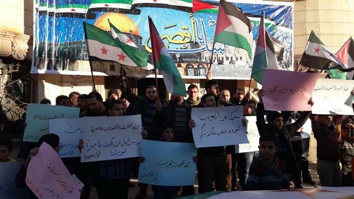 In north Syria, the Palestinians in Syria Relief and Development Association organized a protest and sit-in in the center of Azaz, in the northern suburbs of Aleppo, to condemn the decision. The sit-in included speeches by activists from Syria and Palestine.