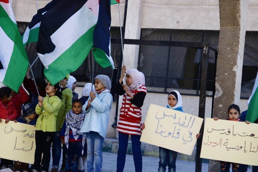 Palestinian children organize a solidarity stand in the south of Damascus, in the support of Jerusalem