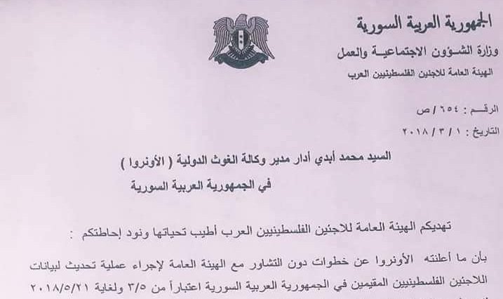 On its part, the General Authority for Palestine Arab Refugees in Syria called on UNRWA, in a statement received by the Action Group, to stop the process of updating the data, considering the details of the conditions unacceptable, and describing them as difficult and harsh.