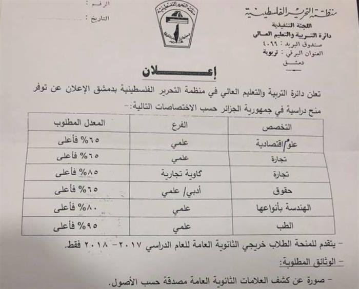 The Department of Education and Higher Education of the Palestine Liberation Organization (PLO) in Damascus announced the launch of Algerian scholarships for Palestinians from Syria.