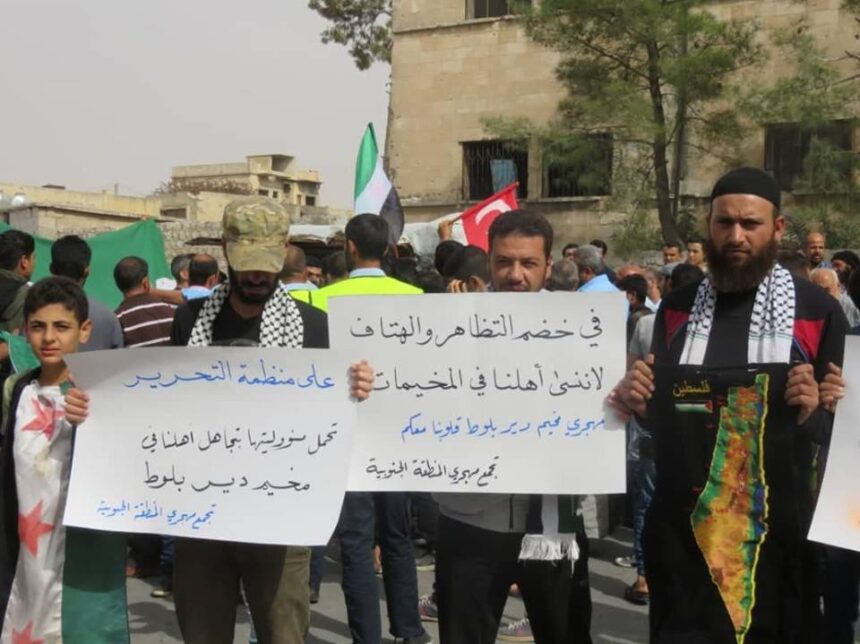 Palestinian refugees displaced from Yarmouk Camp and temporarily sheltered in Maarat AlNu’man, south of Idlib, north of Syria, rallied in solidarity with Palestinian families in Deir Ballout Camp, in Afrin’s outskirts.