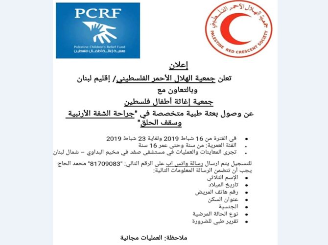 The Palestinian Red Crescent in Lebanon, in partnership with the Palestine Children’s Relief Fund, announced the arrival of a group of surgeons specialized in cleft lip repair and throat surgery.