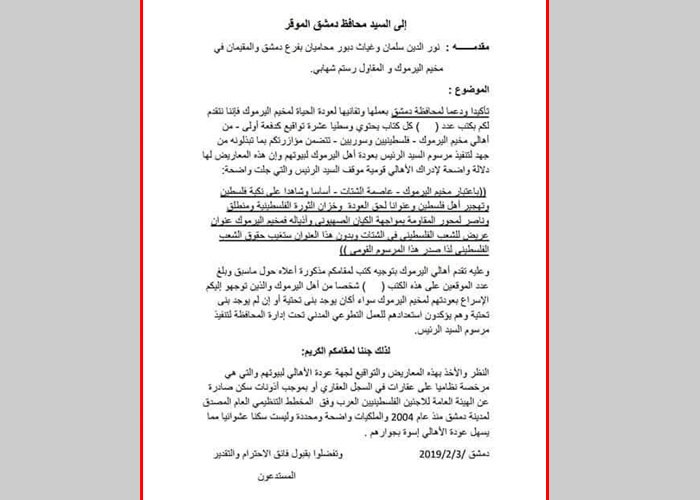 A petition was handed over by the residents of Yarmouk Camp to Damascus governor Adel Anwar AlAlabi, urging local authorities to smooth the return of displaced families to their homes.