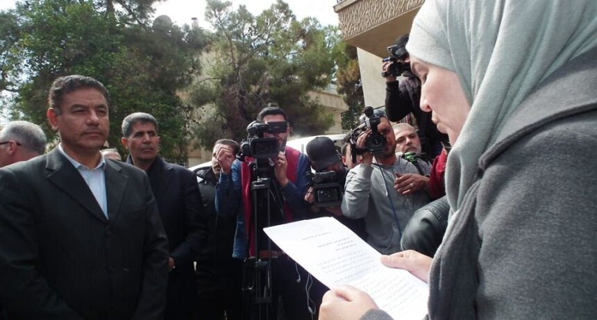 Dozens of Palestinian refugees and representatives of Palestinian factions joined a vigil staged outside of the UN office in Damascus on March 28, 2019, in response to the US President Donald Trump’s recognition of Israel’s sovereignty over the occupied Golan Heights.