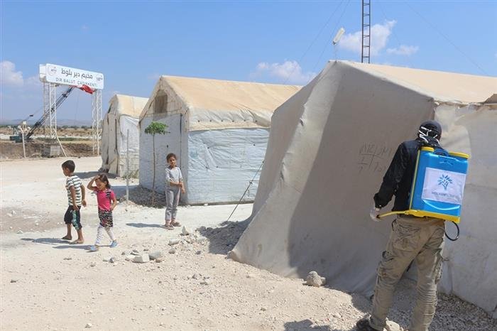 Over recent days, volunteers from Melhem group sprayed insecticides across the camp.