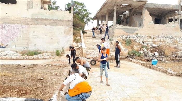 Volunteers from the Palestinian Red Crescent joined a campaign to repair power at the local school in Handarat Camp for Palestine refugees in Aleppo and cleanse the public park.