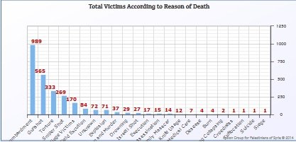 The Documentedstatistics on the AGPS website,”actionpal.org.uk,” indicate that the bombing is first cause of death among the Palestinian refugees in Syria, where it led to the death of (998) victims, while the armed clashes is the second cause,as it led to the death of (598) victims. Torture to death is the third place, as the AGPS documented (380) names of Palestinian refugees who died due to torture in the prisons of the Syrian regime.