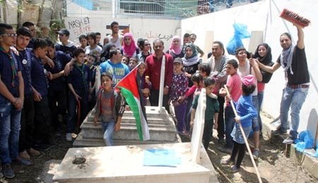 Dozens of volunteers from “Nashit Society” and “Shoala Youth Team” implemented a sit-in and participated in a voluntary day that were held at Ein Al Hilwa camp in solidarity with Yarmouk residents, and in memory of the martyrs of the April 23, 1969. The voluntary day included cleaning Martyrs of April Cemetery at the compound of UNRWA schools.Â