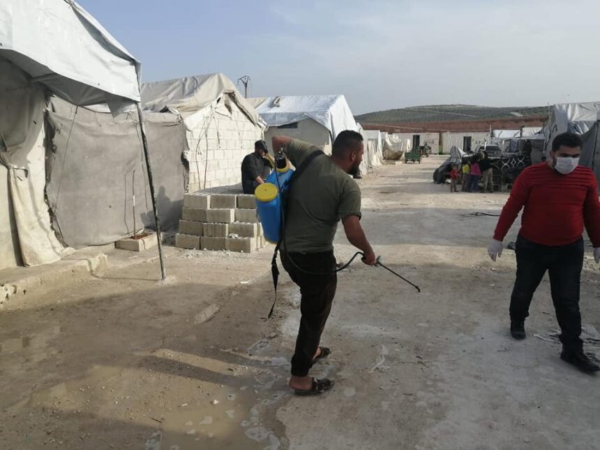 Volunteers from Mulhem Group embarked on March 23 on a campaign to sterilize parts of Deir Ballout refugee camp, in the northern Syrian region of Efrin, in an attempt to limit a propagation of coronavirus (COVID-19) among the residents.