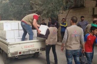 The Two Relief Institutions of Nour and Jafra Distribute Food Aid to the Displaced Families from Yarmouk to Yelda Town.