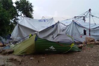 The rain floods the refugees’ tents in Vial Camp, on the Greek island of Chios