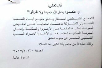 The Palestinian Independent Gathering calls for a sit-in protest to demand that UNRWA delivers aid to families in south Damascus